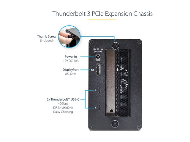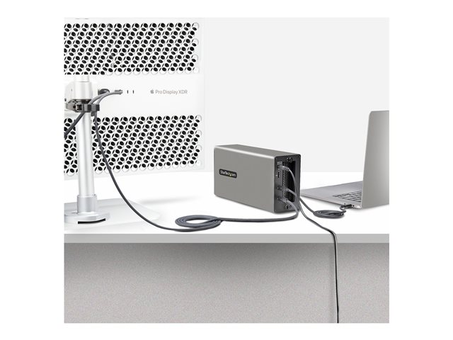 Ajoutez deux cartes compatibles PCI-Express 3.0 x16 et augmentez les capacités potentielles d'un ordinateur portable, d'un ordinateur de bureau ou d'un tout-en-un compatible Thunderbolt 3 ou 4. Ce boîtier d'extension Thunderbolt 3 PCIe vous permet de profiter de la vaste gamme de cartes d'extension PCIe avec des ordinateurs qui ne disposent pas de fentes PCIe. Le boîtier vous permet de connecter un écran externe via les ports DisplayPort (DP) ou Thunderbolt 3, prenant en charge des résolutions Ultra Haute Définition (UHD) en 4K ou 8K.