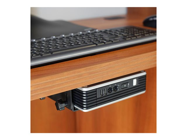 Ce support polyvalent permet d'intégrer facilement un client léger ou un petit ordinateur dans votre espace de travail. Sa conception universelle s'adapte aux dimensions de la boîte, tandis que son interface de montage se fixe à une variété de surfaces: sur une plaque VESA, directement à un bureau, sur une perche ou sur un rail mural Ergotron.