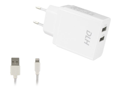 DLH DY-AU2551WMFI - Adaptateur secteur - 12 Watt - 2.4 A - 2 connecteurs de sortie (USB) - sur le câble : Lightning - blanc