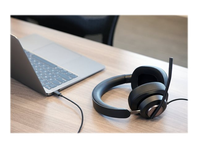 Le micro-casque USB-C H2000 de Kensington offre une expérience immersive et concentrée, une technologie audio exceptionnelle et des fonctionnalités de productivité haut de gamme via une conception supra-auriculaire ergonomique. Le H2000 offrent des écouteurs à mémoire de forme avec gel refroidissant recouverts d'un tissu respirant à transfert de chaleur pour un confort longue durée, des micros à suppression du bruit qui éliminent les bruits parasites, des témoins lumineux " ne pas déranger " et de désactivation du son pour réduire les distractions, des commandes intégrées et un effet vocal (Sidetone) optimisant les appels. Les haut-parleurs dynamiques de 40 mm en néodyme vous offrent une expérience audio exceptionnelle pour les appels et la musique. Un long câble USB-C anti-nœud en nylon tressé de 1,80 m vous offre une grande liberté de mouvement en cas d'appel prolongé. Le micro-casque H2000 fait partie de l'écosystème de visioconférence professionnelle de Kensington. Vous bénéficiez ainsi d'une expérience intégrée qui vous permet de consacrer plus de temps à accroître votre productivité.