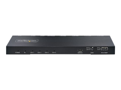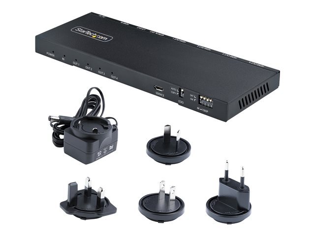 Ce répartiteur HDMI 4 ports avec scaler intégré connecte une source vidéo HDMI à quatre écrans HDMI, avec prise en charge des résolutions UHD 4K, du HDR (gamme dynamique élevée) et de l'audio 7,1 canaux.
